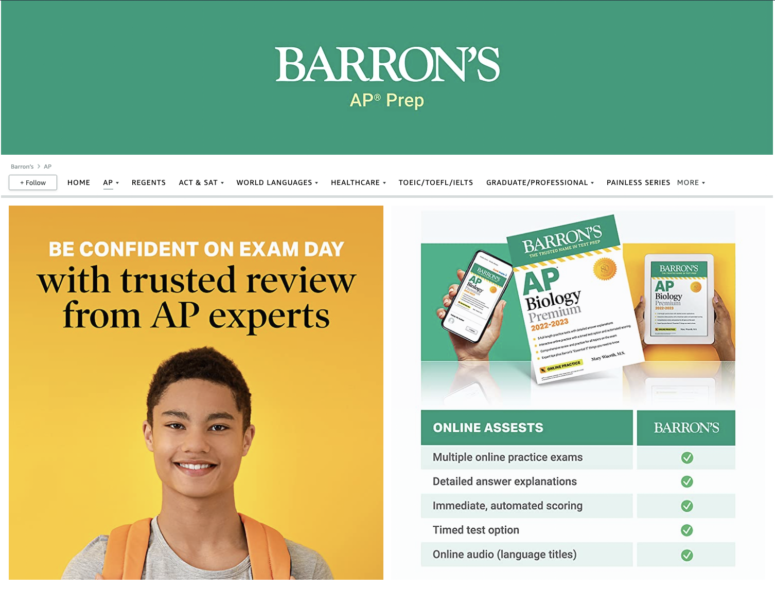 Above are images of the standard Barron’s block campaign for the Amazon store and my fresh take on it. The design uses existing images from our library but combines them in a new and exciting way. The illusion of 3D and movement is achieved in the composition through the illusion of a carousel as well as the reflections off of a hard surface. This design stays on brand while adding a more modern look.